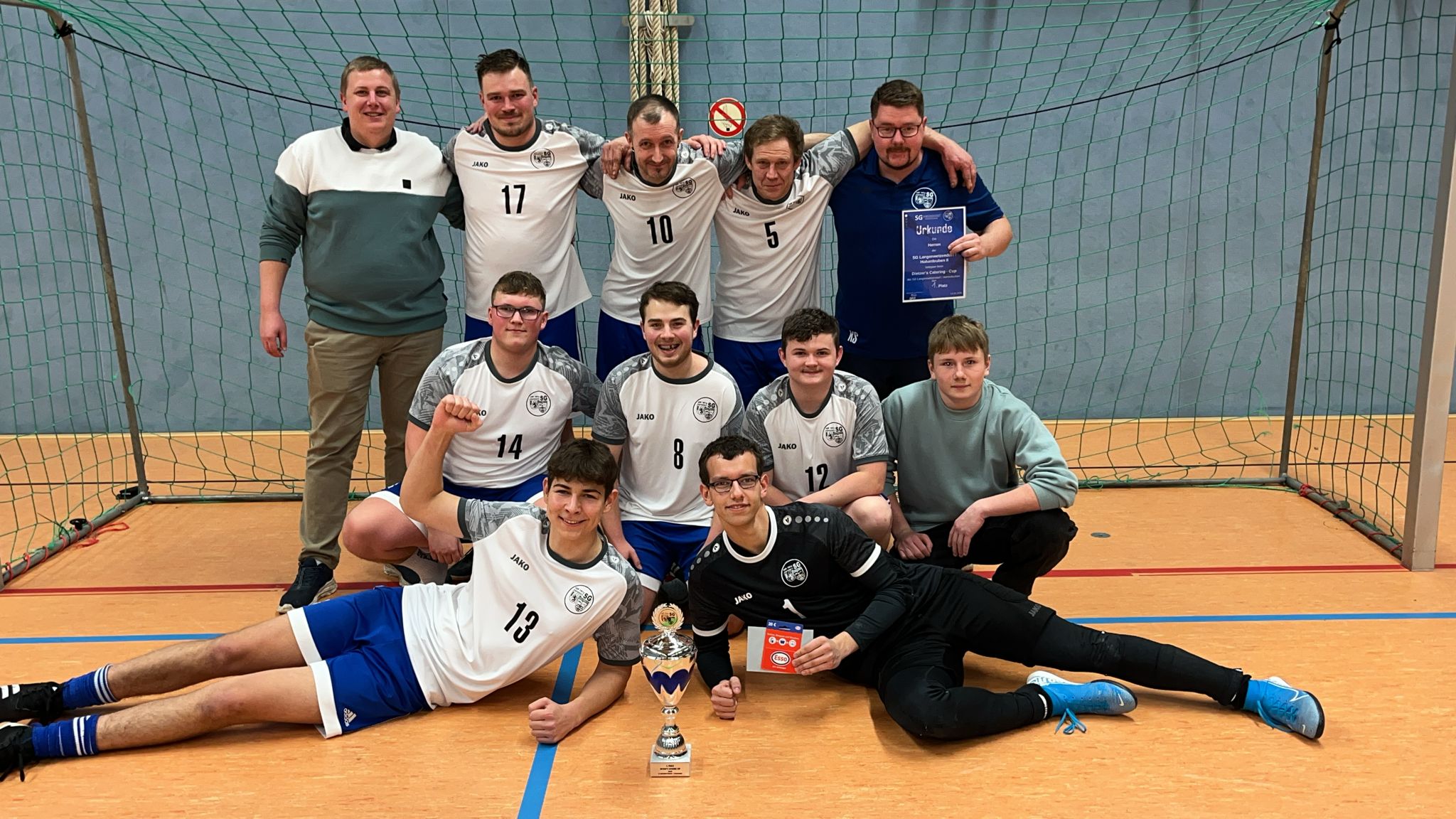Beim Turnier der zweiten Männermannschaft am Samstagabend spielten nach einer Absage fünf Mannschaften im Modus Jeder-gegen-Jeden mit Doppelrunde um den Dietzer’s-Catering-Cup. In einem engen Turnier blieb es bis zum Schluss spannend und erst im letzten Spiel wurde der Gesamtsieg entschieden. In diesem schlug die SG Holzland II die Zweite der SG Zeulenroda-Triebes. Die Holzländer belegten damit mit 13 Punkten den dritten Platz, während die Triebeser bei ebenfalls 13 Punkten blieben und sich nicht mehr am Führenden vorbeischieben konnten. Dies war die Zweite unserer SG, die sich mit 16 Punkten und 13:8 Toren den Turniersieg holte.